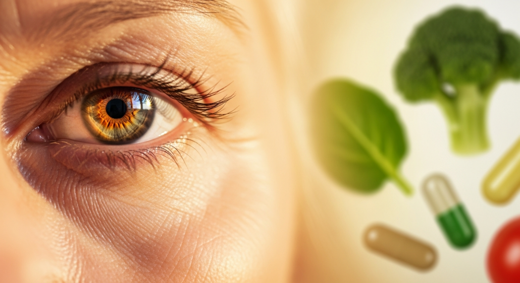 Senior woman with healthy eyes surrounded by eye-health nutrients including lutein-rich leafy greens and supplement capsules